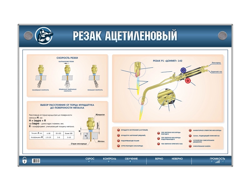 Стенд предназначен для изучения работы резака ацетиленового студентами профильных учебных заведений.