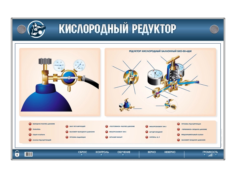Демонстрация работы стенда осуществляется при помощи вращения регулировочного винта кислородного редуктора, с индикацией изменения показаний манометра направлений входящих и исходящих потоков газа. Дополнительно для изучения конструкции кислородного редуктора предусмотрено два режима работы со стендом: "Обучение" и "Контроль". В режиме "Обучение" на панели управления, расположенной в нижней части стенда, при помощи элемента управления выбирается один из подразделов, световая индикация подсвечивает данную позицию, а программное обеспечение "Виртуальный учитель" повествует о характерных особенностях и правилах эксплуатации. В режиме "Контроль" программный код управления генерирует случайный вариант вопроса. При правильном или неправильном выборе ответа загорается соответствующая принятым стандартам светодиодная индикация.Комплектация